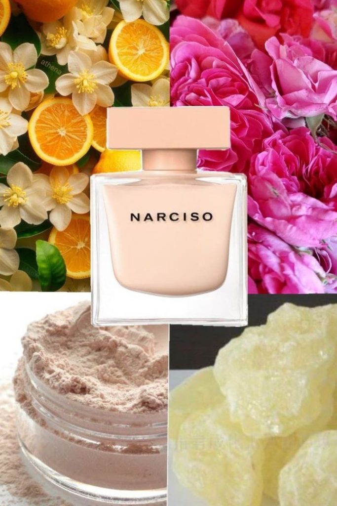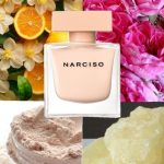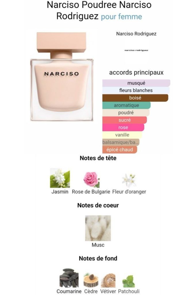 عطر ادکلن نارسیس رودریگز نارسیس پودری-Narciso Rodriguez Narciso، با رایحه ای خارق العاده و اکسیری جادویی کاملا جذاب و دوست داشتنی بوده و با شیرینی دلپذیر خود مناسب برای شب های خنک بهاری می باشد. خالق این محصول در باره ی آن می گوید : من می خواستم محصولی به شدت اغوا کننده با رایحه ای هوس انگیز طراحی کنم که سر هر مردی را به سمت خود بچرخاند و بانویی که از آن استفاده می کند را فریبنده و دلربا جلوه دهد. ترکیب آن با شیرینی لطیف و روح انگیز گل رز و یاسمن سفید آغاز شده که به قلبی از مشک گرم می رسد . این مواد بر روی بیس تندی از آکوردهای خسخس و سدر سیاه و سفید استوار می باشند . بطری آن ساده ، مربع شکل، به رنگ سفید شیری با حروف نوشته شده ی مشکی است که توسط مدل معروفی به نام Raquel Zimmermann تبلیغ شد.
